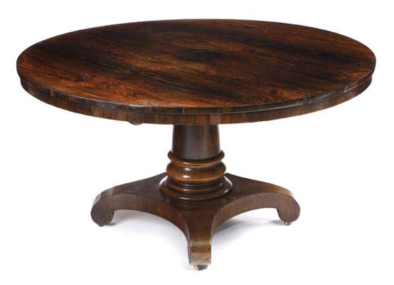 the circular tilt-top on a tapered lobed column ending in a quatreform concave base with concealed castors