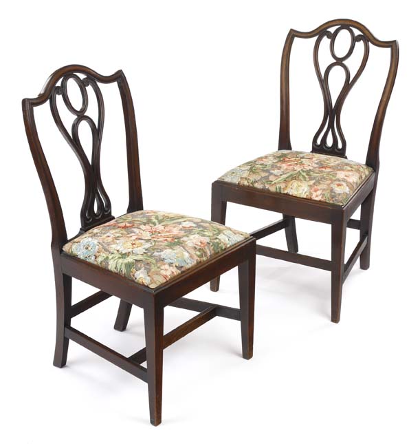 the moulded backs with shaped top rails and S-scroll and oval pierced backs, the drop in seats on square tapering legs joined by H-stretcher (7)
