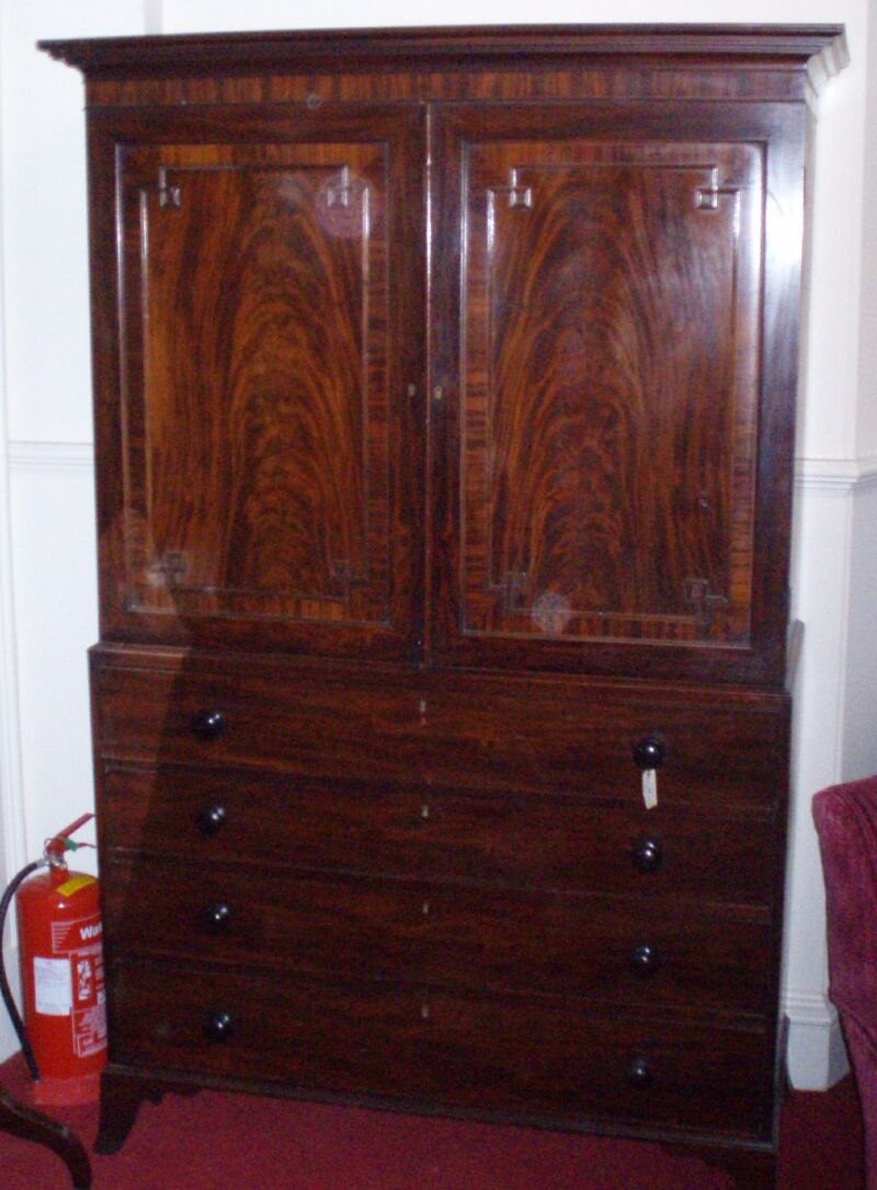 the stepped moulded cornice above a pair of flame mahogany panel doors with reeded mouldings and crossbanding, the interior fitted with three sliding trays and two drawers, above a secretaire drawer fitted with a baize inset and an arrangement of eight yew wood veneered small drawers and pigeon holes, below are three long graduated drawers on splayed bracket feet