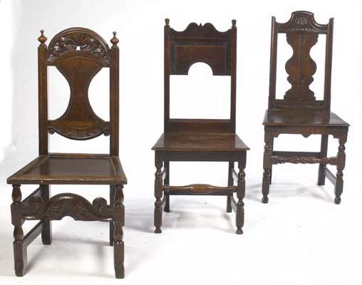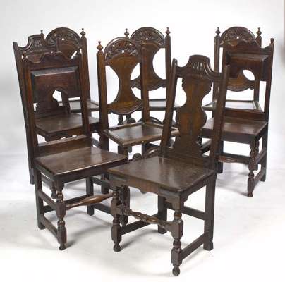 four with arched crestings and decorative scroll carved front stretchers, a pair with scroll carved crestings and vase-shaped splats, a further pair with swan-neck carved crestings and arched half-panelled backs, all on turned and block baluster legs united by stretchers (8)