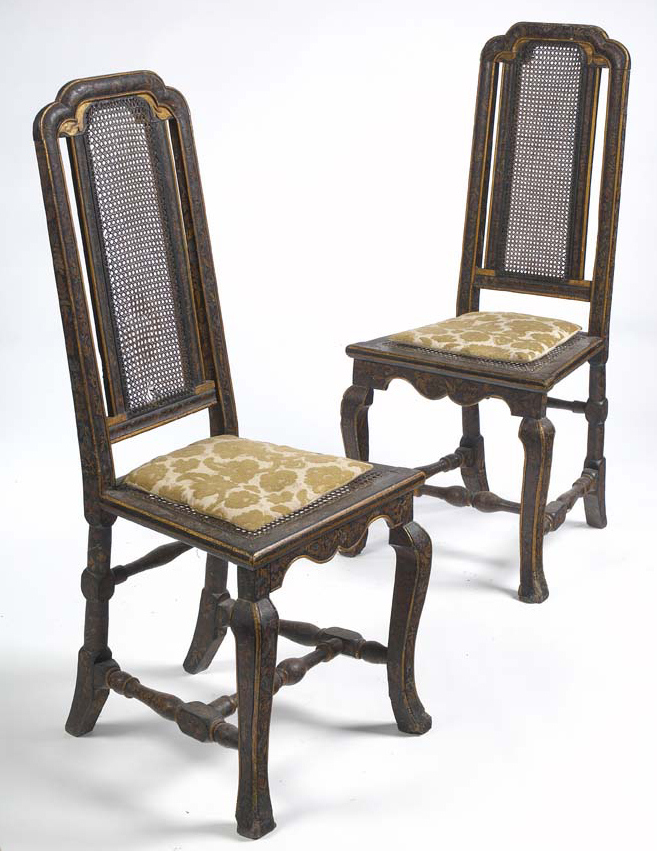 A pair of William and Mary period indigo lacquer, parcel gilt and fern applique high back chairs