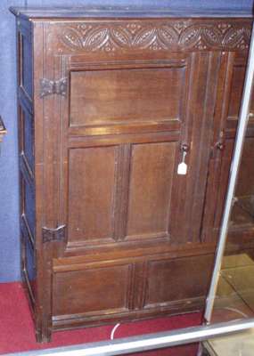 the lunette carved frieze above a pair of panelled doors on butterfly hinges and panelled apron, on channel moulded uprights and stem feet