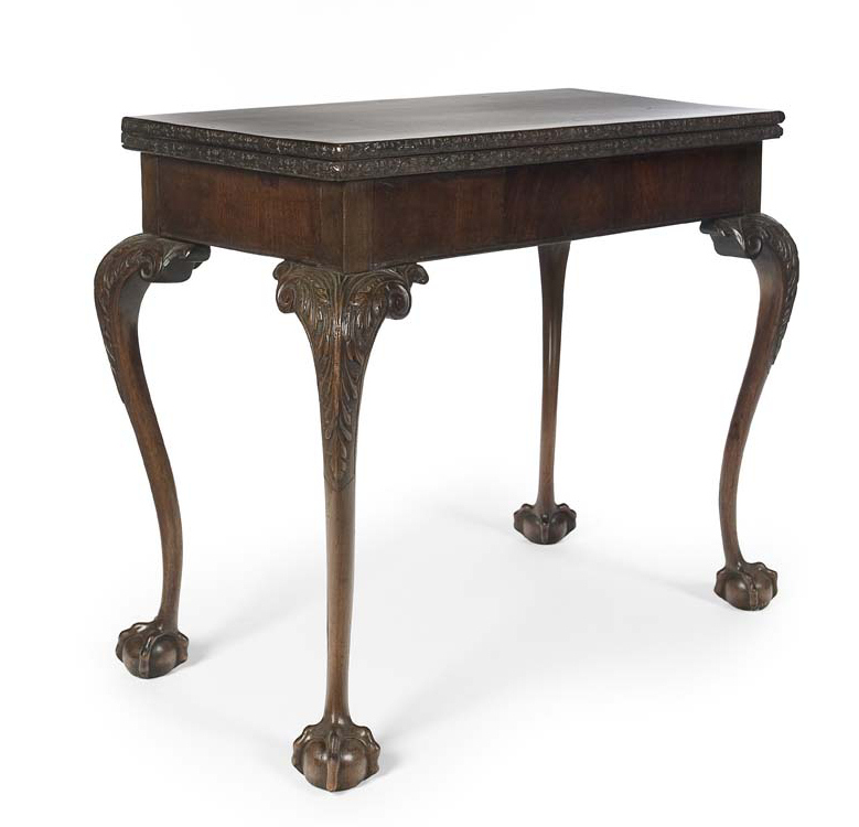 the rectangular top with floret carved edge above a plain frieze, on boldly hipped acanthus carved legs ending in claw and ball feet