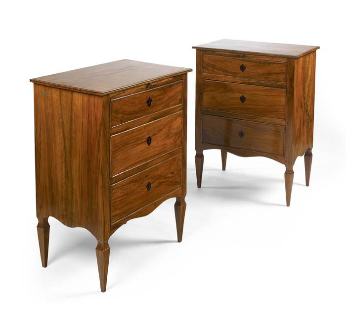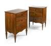 of small proportions, each with a moulded rectangular top above a fitted slide and three graduated drawers, on a shaped apron and square tapering legs (2)