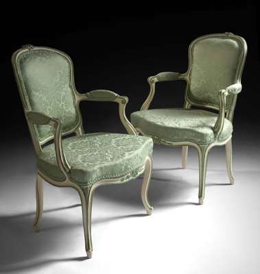 the cartouche shaped backs with floret crestings above padded outscrolling arms and serpentine stuffover seats with floral carved front rails, on moulded and shell carved tapering cabriole legs on tapering feet, overpainted in ivory and green, with green silk damask upholstery (4)