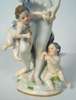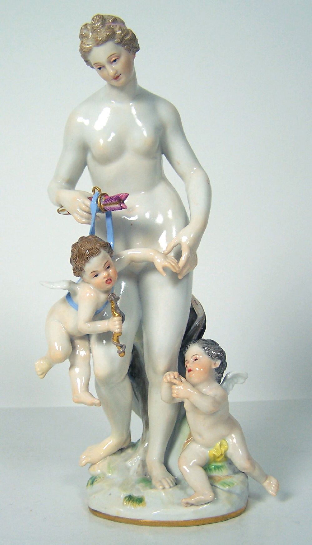 depicting Venus, standing in the nude, dangling Cupid from her quiver of arrows, his bow in his hand, with another cherub at their feet, on a naturalistic base, underglaze blue crossed sword mark, incised 'H65', impressed '48'