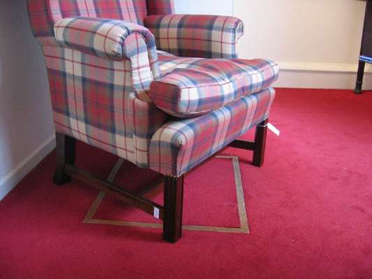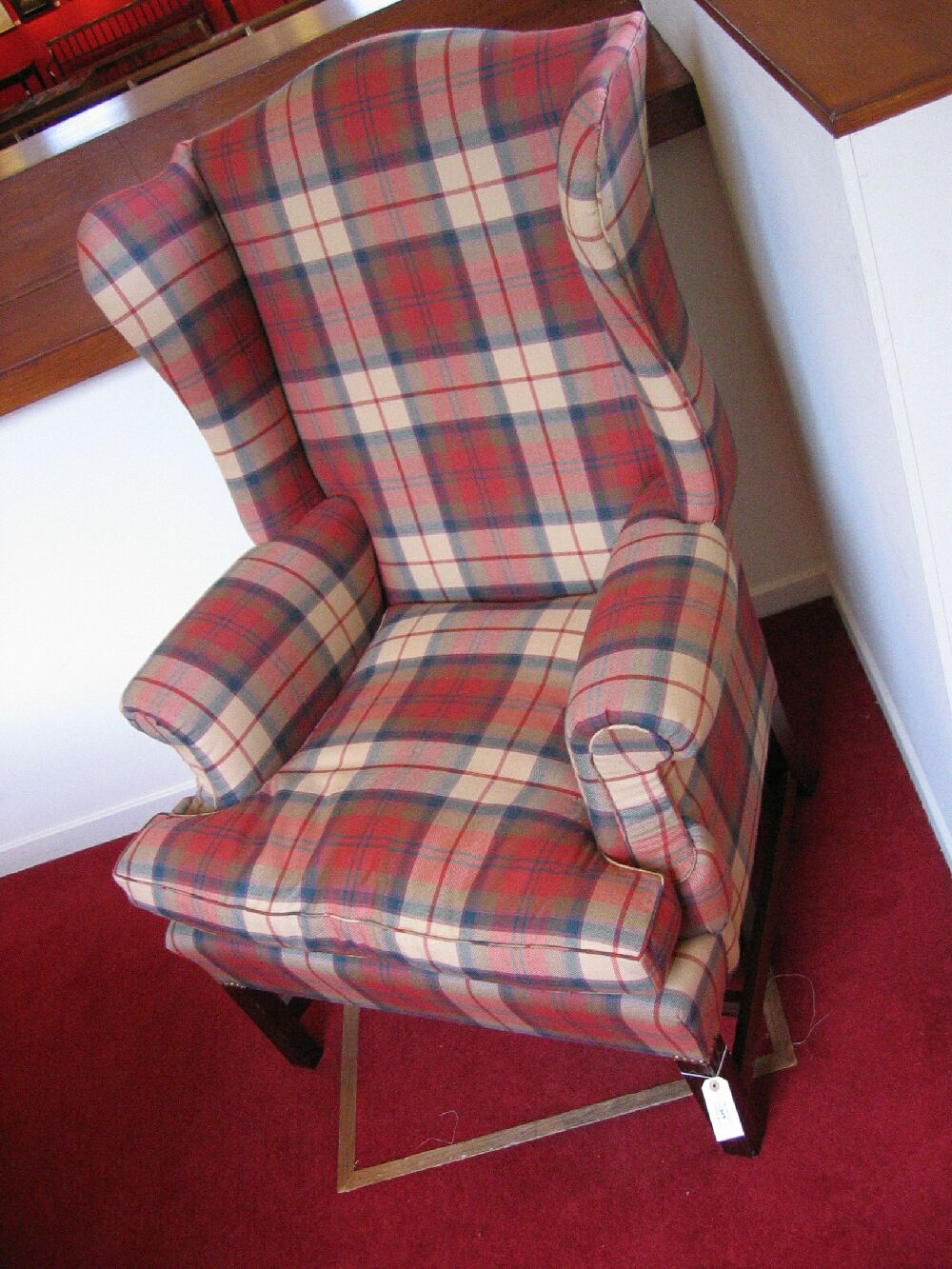 A pair of Georgian style mahogany framed and tartan upholstered wing armchairs By Whytock & Reid, Edinburgh