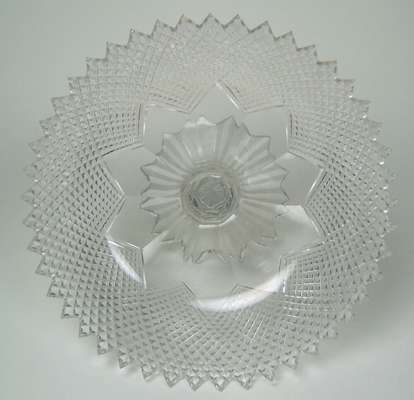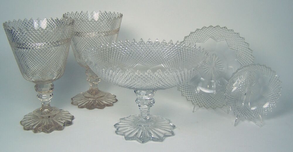 each with diamond cut body, comprising: a pair of tapered urns and covers, each with faceted knop finial on faceted knop stem, with scalloped star cut foot, 34cm high; a pair of circular tazzas, 23cm diameter; a circular bowl; and eight graduated plates (15)