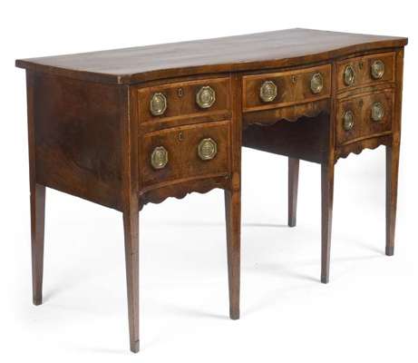 A George III period mahogany and satinwood crossbanded serpentine sideboard