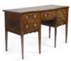 the shaped frieze with central drawer flanked by a deep drawer, panelled as two long and two short drawers, with octagonal foliate stamped brass handles, on square tapering legs headed by foliate paterae and 'gothic line and dot' stringing