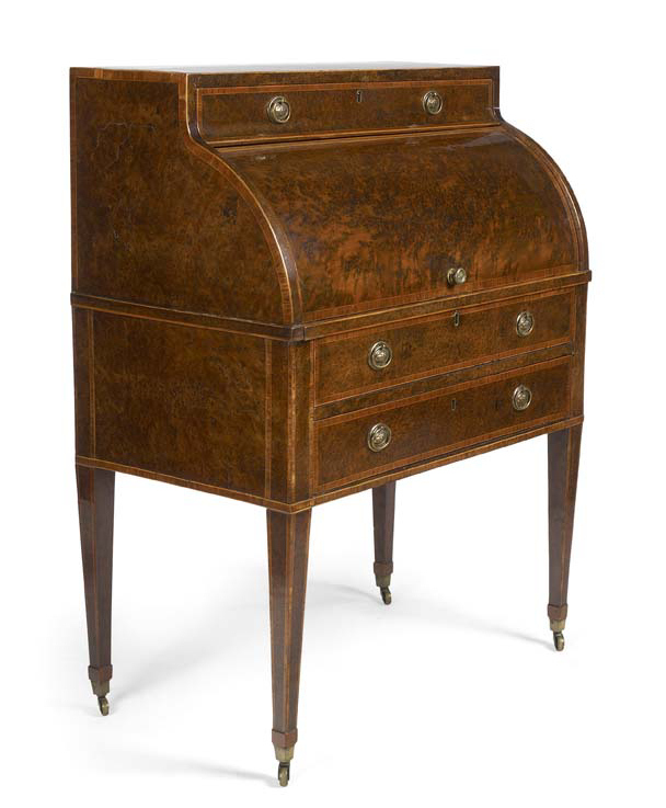 A George III period burr yew-wood and tulipwood crossbanded cylinder desk After a design by Thomas Sheraton