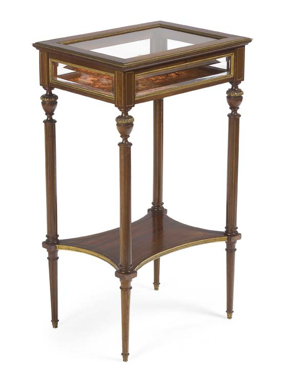 of small proportions, the hinged rectangular top and sides with bevelled glass panels and plush lined interior, on slender fluted legs united by an undertier, ending in toupie feet, the whole with beaded and engine turned mounts