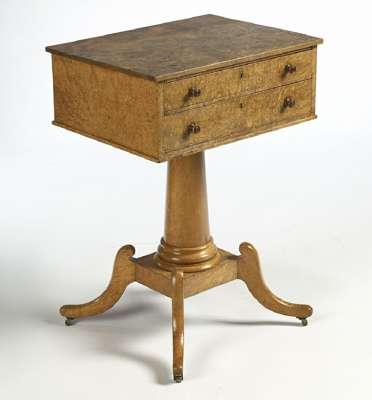 the rectangular top above two full width frieze drawers with turned handles, the top drawer fitted with divisions, on a spreading column with moulded socle and platform raised on four sabre legs ending in castors