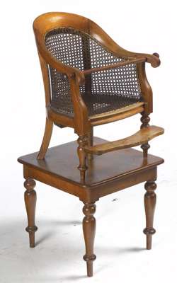 the arched wrap around back with split cane upholstery, turned bar and footrest, on short baluster turned legs and rectangular platform on baluster turned legs