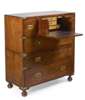 made in two portable sections, the central frieze drawer with bird's eye maple fitted interior and a sliding drawer cover (for use in transit) between two deep drawers and three long graduated drawers with recessed brass handles, on turned bun feet