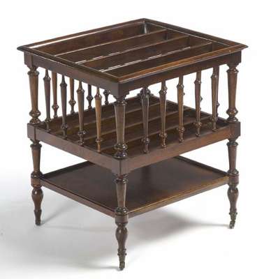 of four divisions, with everted edge and spindle filled sides above an open shelf, on slender baluster legs ending in miniature brass caps and castors