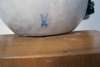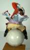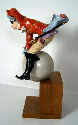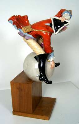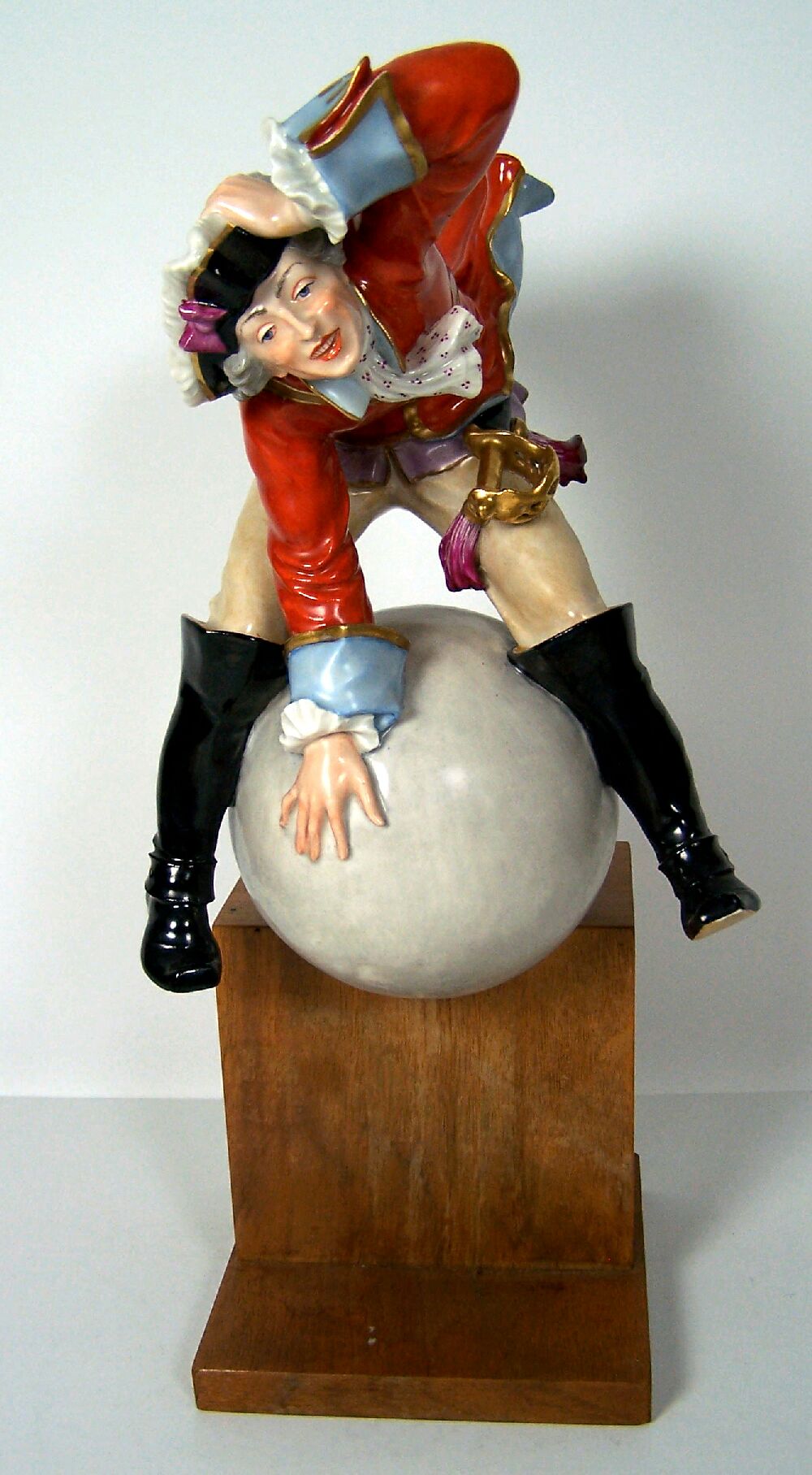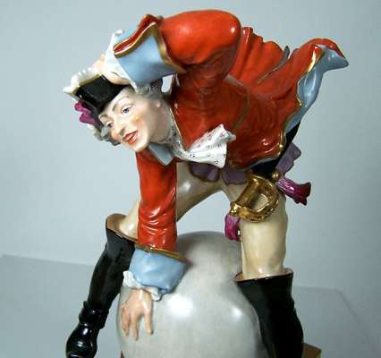 wearing a tricorn hat, red coat and black boots, seated astride a cannon ball, on a wooden stand, underglaze blue crossed sword mark, cancelled, incised Sturm
