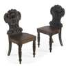 each cartouche shaped back boldly carved with lotus leaf and acanthus scrolls around a wild boar mask above a solid channel moulded seat, on turned and reeded tapering legs (2)