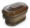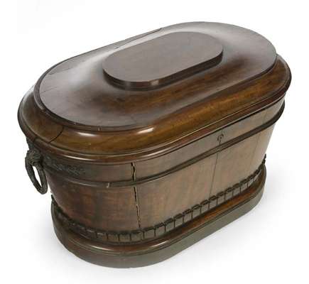 the moulded hinged lid enclosing a lead lined interior above tapered sides with twin laurel wreath cast handles and castellated apron, raised on a moulded plinth base with brass castors
