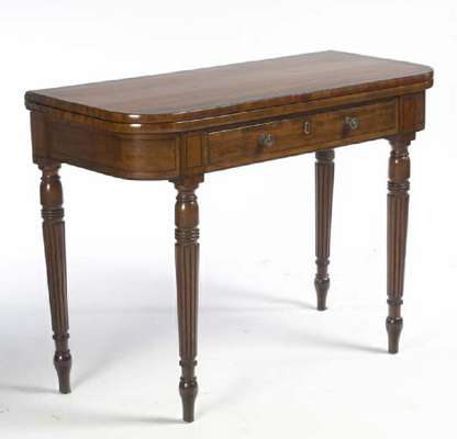 the rounded rectangular top above an ebony line inlaid frieze with single drawer, on turned and reeded tapering legs, with double gate action, ending in bulb feet