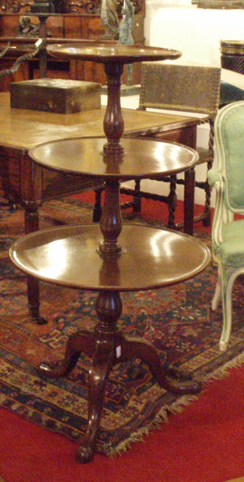 of three dished and graduated tiers around a central baluster turned column, on cabriole tripod base with pad feet
