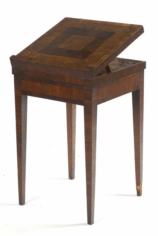 the square banded top with bookrest enclosing a lined void with ratchet supports, the inlaid frieze above square tapering legs, the whole decorated with ebony lines
