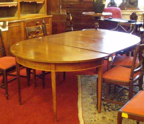 the demi-lune ends with single leaf above a satinwood and ebony strung frieze, on square tapering legs