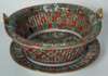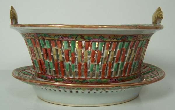 the oval basket with raised gilt leaf handles and pierced sides, the stand with pierced border, the borders decorated with flowers and butterflies, each well with alternating radiating figural and flower panels (2)