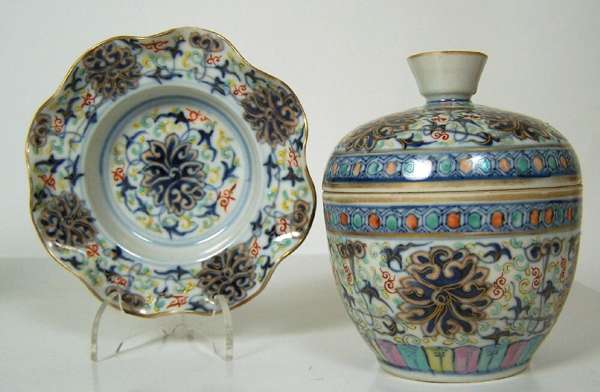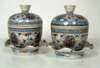 A pair of Chinese rice bowls, covers and stands