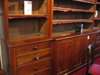 the moulded cornice over open adjustable shelves with leather fringe, the lower section with two central panelled cupboard doors, flanked by eight graduated drawers, raised on a plinth base