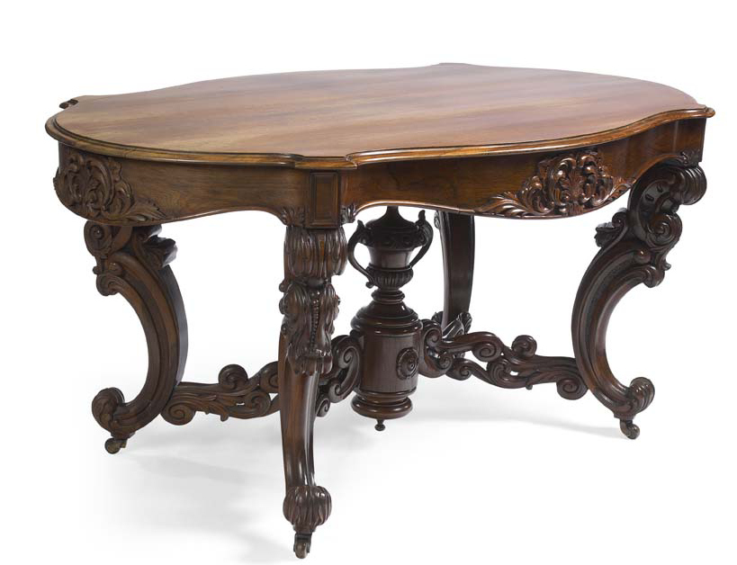 the top of serpentine outline with moulded edge and shaped apron with leaf carved escutcheons, enclosing a pair of frieze drawers on profusely carved cabriole legs united by pierced and floral carved X-stretchers surmounted by an urn-shaped boss, on china castors