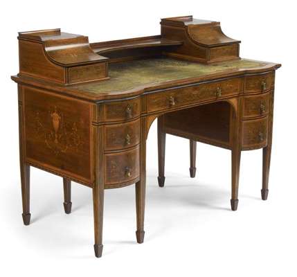 the top of inverted break-bowfront outline with tooled green skiver and two sloping stationery compartments flanking a central shelf, the kneehole bounded by a frieze drawer and six short bowfront drawers, on square tapering legs ending in spade feet, the whole decorated with neo-classical urns and vignettes of putti playing musical instruments