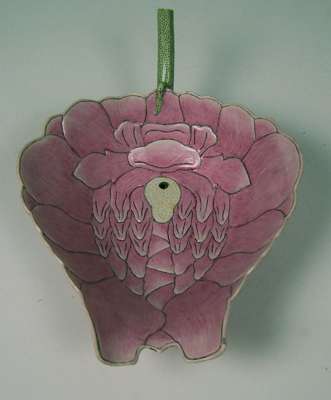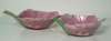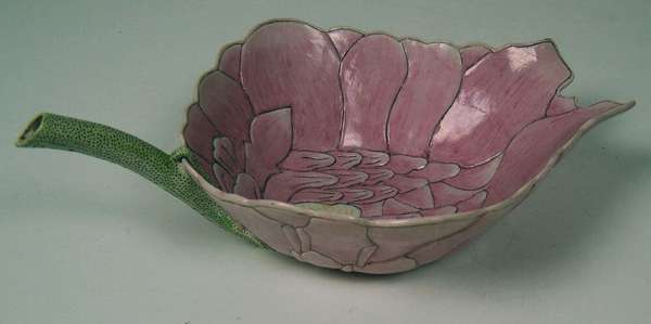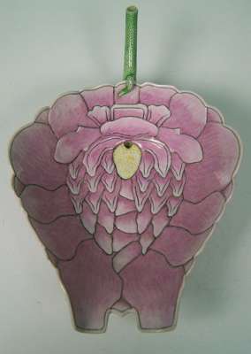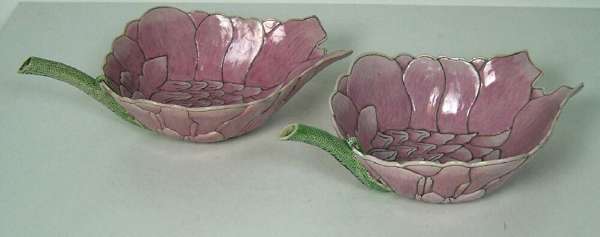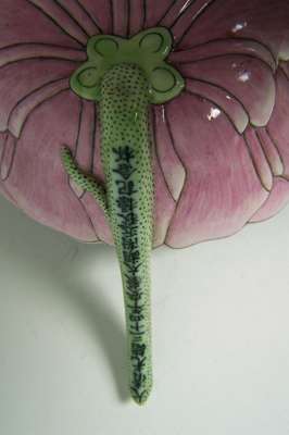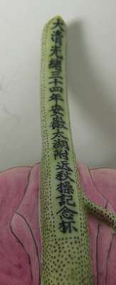 finely and naturalistically modelled with pink petals tinged with white, the yellow-dotted stamen pierced with a small circular aperture connecting it to the hollow seeded lime-green stem forming the handle, inscription to stem indicating they were made in 34th year of the reign of Emperor Guangxu (2)