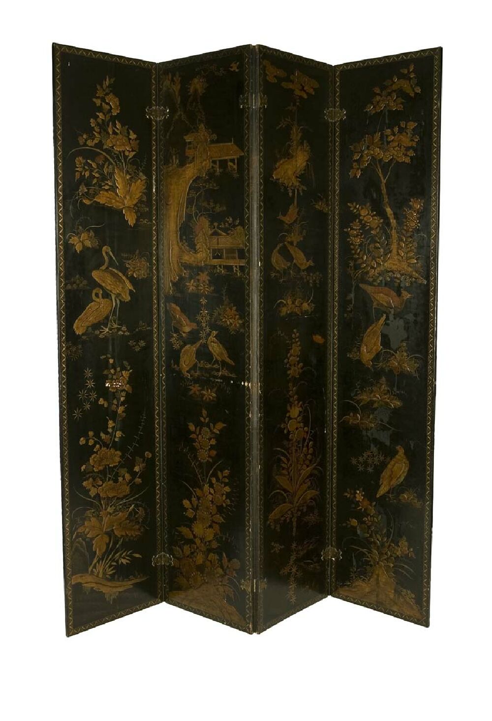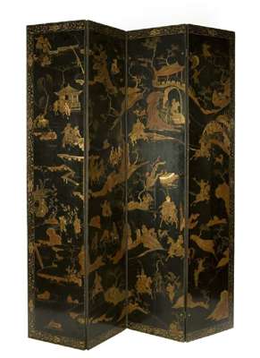 A 19th century Chinese polychrome lacquer four fold barrier screen