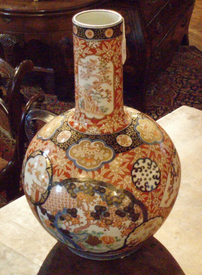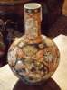 with cylindrical neck above globular body decorated with gilt and cream flowers on a red ground, with overlapping circular and cartouche panels, with geometric forms and stylised landscapes, blue painted signature