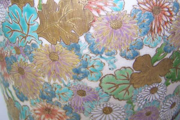 with flared rim above ovoid body, the shoulders decorated with phoenix against a wave background, the body decorated with bold flowers and roosters, signed