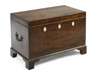 the hinged top enclosing a small bank of drawers and a void above three ivory escutcheons and brass carrying handles, on bracket feet, the whole with chequer stringing