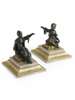 the male and female figures gesturing with one arm raised and seated on a plinth styled as a gilded and taselled cushion with their legs crossed, their gowns incised with chinoiserie, on associated giltwood stepped plinth bases (2)