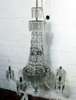 of baluster form hung with a cascade of faceted drops and two graduated rings with oblong drops, the scrolling branches with foliate drip pans above a faceted sphere pendant