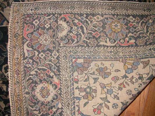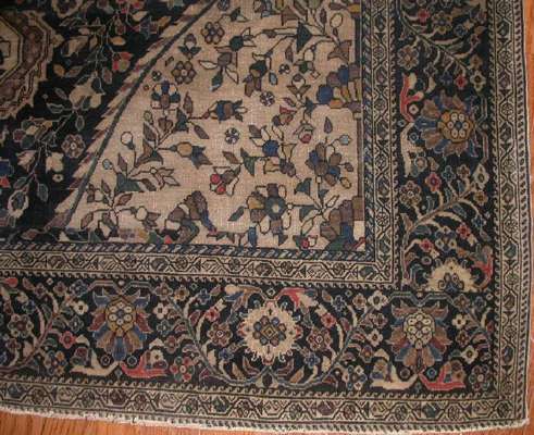 late 19th century, the dark indigo field with large cream lozenge medallion suspending pendants, similar spandrels, within indigo rosette, palmette and foliate vine border between bands