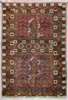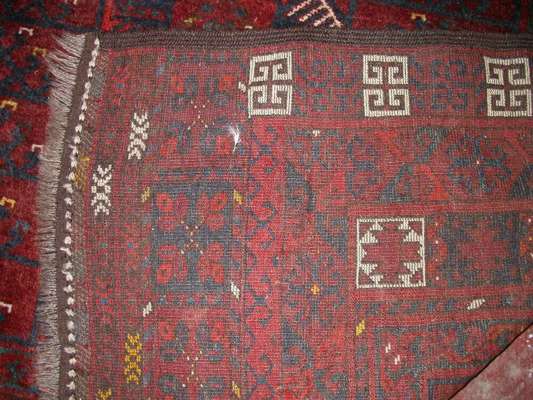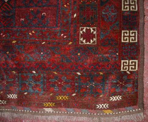20th century, the dark red cruciform pattern field with two hooked panels, within red serrated lozenge, hooked X and Greek key borders