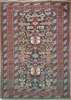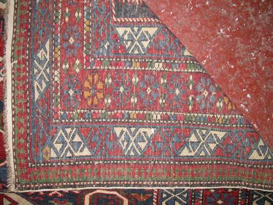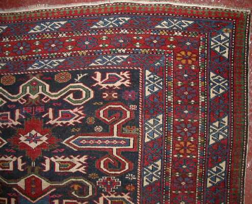 late 19th/early 20th century, the indigo field with two ivory octangonal medallions and red starburst medallion surrounded by stylised ram's horn motifs, within a red rosette border between hooked stripe bands