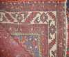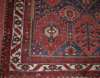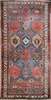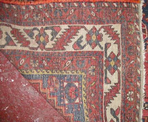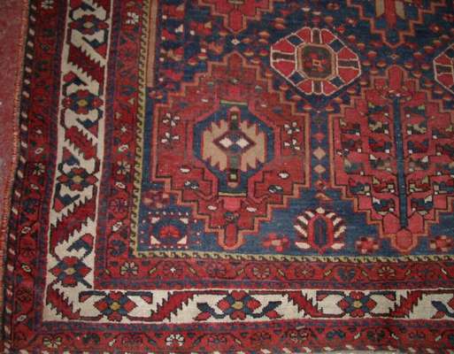late 19th/early 20th century, the abrash blue field with allover polychrome stepped foliate lozenge lattice, within an ivory rosette and serrated leaf border between similar red bands
