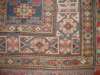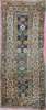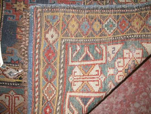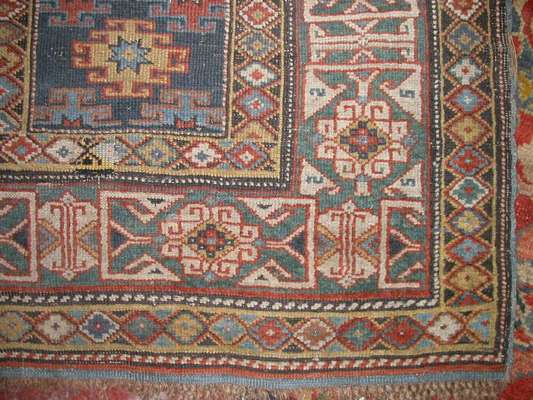 late 19th century, the abrash indigo field with allover polychrome hooked small medallion pattern, within green-blue kufic border between polychrome lozenge bands
