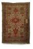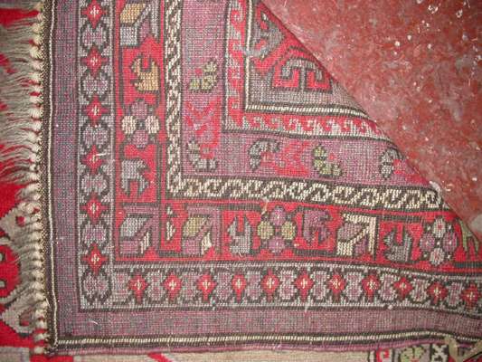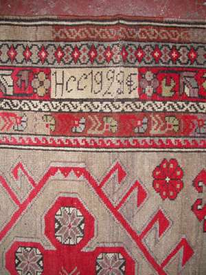 apparently dated 1929, the abrash grey field with a cusped and hooked red medallion suspending scorpion pendants, within a red rosette and vine border, with dated inscription panel, between floral bands