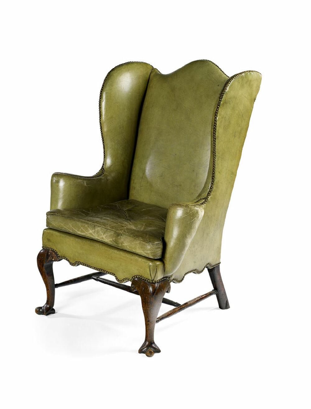 the arched top, back, arms and seat cushion covered in studded green leather, on cabriole legs ending in trefoil feet