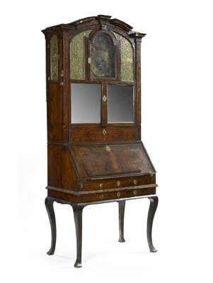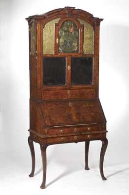 An unusual George I period walnut bureau-bookcase, incorporating an automaton musical clock movement by Christopher Pinchbeck