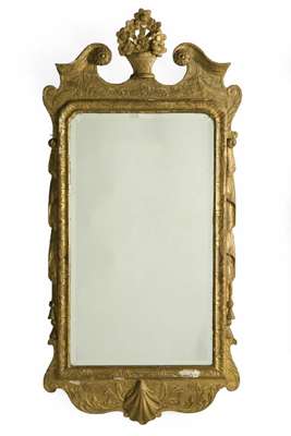 the broken arch pediment with a central floral vase, below is a later bevelled mirror plate within a leaf carved inner frame with outer tassels, the shaped apron with a central shell motif (losses)