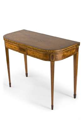 A late George III period satinwood and tulipwood crossbanded foldover games table