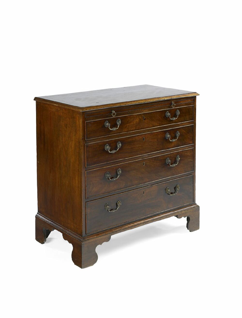 the crossbanded moulded top above a brushing side and four long graduated drawers, on shaped bracket feet